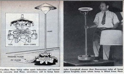 Building on Michael Faraday’s research and discoveries, Talbert noted that, “Even today America’s rapidly expanding electronics industry is constantly finding new uses for electromagnets. For example, Jack Fletcher, a young electronics and aeronautical engineer of West Covina, California, has just built a ‘Twenty-First Century Home’ containing an electronic stove functioning by magnetic repulsion,” among other appliances, such as the lamp illustrated above.