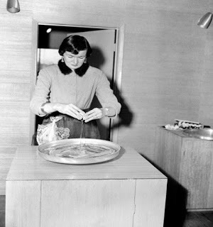 4 January 1955: Mrs. Joan Fletcher demonstrates cooking skills with the floating pan electromagnetically suspended over her husband Jack’s magnetic repulsion stove. Source: Popular Mechanics magazine.