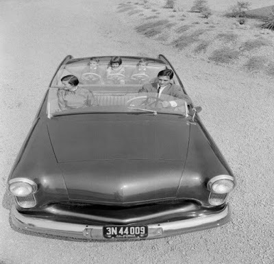 Back to the Future, for real. Here Jack and Joan Fletcher of West Covina, California, are seen driving their children, left to right in back seat: Johnny, 21 months, Janie, 3 yrs., and Ricky, 21 months.