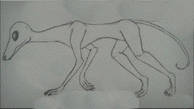 Below is an image I found is similar what I saw. The differences are that what I saw had long ears and that the legs of the animal I saw were like a deer's and not like a dogs. It also was not crouched over at all, it stood very upright." TO