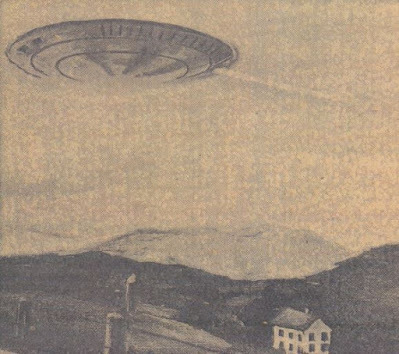 From Keller Venus Files: Eugene M. Gluhareff, president of the Gluhareff Helicopter and Airplane Corporation of Manhattan Beach, California, commissioned this painting of the “Flying Saucer of the Future” and unveiled it at a late 1955 meeting of aviation and electronics company executives. According to Gluhareff, the saucer was designed “for exploring far beyond the Earth’s atmosphere and gravity field. The painting shows the flying saucer operating at “moderate speed” over the New England countryside. The business leader pointed to “a propulsive blast of the electron beams from the rear of the saucer, giving it a translational force.” He speculated that such a craft could conceivably “fly to Venus and back in thirty minutes,” since the speed of light was not even considered a limiting factor in the drive unit.