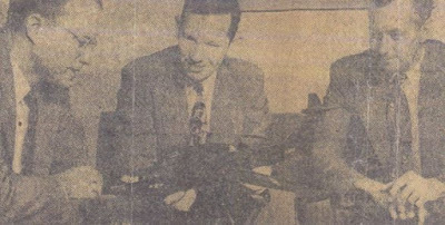 At meeting in Maryland, November 1955, George S. Trimble, Jr., vice-president in charge of advanced planning of Martin Aircraft Company, left, discussing the application of anti-gravitational research to aviation with two Martin aerospace scientists, J. D. Pierson, center, and William B. Yates, right. Be sure to check out Part XII of this series to see the actual flying saucer they were developing behind the scenes, in concert with the government, aircraft and electronic companies, and millions of investment dollars.