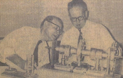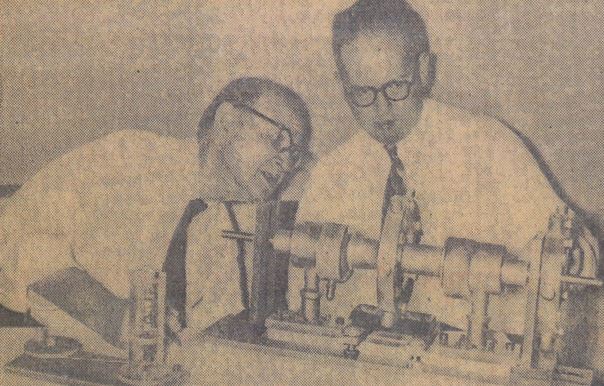 From Keller Venus Files: Dr. Charles T. Dozier, left, senior research engineer and guided missiles expert of the Convair Division of General Dynamics Corporation, conducts an anti-gravity research experiment with Martin Kaplan, Convair senior electronics engineer.