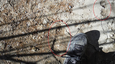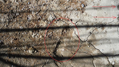 I walked down into it and discovered what looked like a child's barefoot footprint in the semi-wet sand in the bottom of the wash. Since it was in February and only 5 degrees outside I couldn't imagine someone letting their kid walk around in the mud barefoot. In the pix at one point it looks like the juvenile had stood with its feet together looking up through part of the bushier section of that wash. That wash away from the crossing road is around 30' deep yet only about 5-6 feet wide and very curvy.