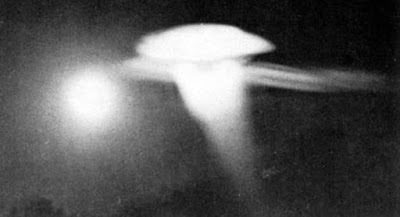 This UFO was photographed by James Lucci, 17, on 8 August 1965, at around 11:30 p.m., in the skies over Beaver County, Pennsylvania. James had gone out with his older brother, John, 23, to the outskirts of Beaver Falls to get away from the city lights to photograph a full moon, when they chanced upon this unusual object that appeared to be taking off. According to the Cosmic Ray, the glow surrounding the UFO is a clear demonstration of the Searl effect, where the atoms in atmospheric molecules are being ionized by the energized power coils of an interplanetary scout craft.
