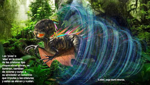 As we can see, the Negrón brothers also described the detail that the spikes on the crest on the back of the creatures lit up alternately and also that the sound of something like a jet turbine or wind turbine was heard when the creatures arrived and/or left. That matches what the little boy from Orocovis told us about the creature he saw having the same type of spikes on its back and how he saw a swirl of wind forming around it before it rose into the air after rapidly waving the 'luminous spikes' on its back.