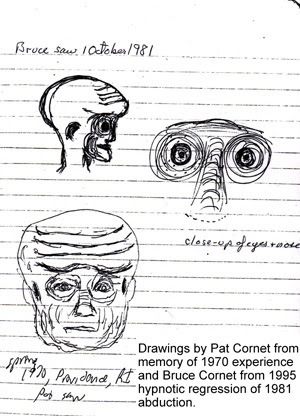 Kathy wanted Pila and Nancy Weber to view our auras to see if there was anything unusual. The room was darkened somewhat, and Pat and I sat against a white wall. Viewed from across the room both Pila and Nancy noticed exceptional aural development in colors around both of us - blues and greens. Pila said he had never seen such a pronounced aura on anyone. They both noticed and described an elongated cone-shaped distortion to our auras in the same places - originating from just below our right ears and extending upwards and outwards as a disjunction or disturbance in our auras. They concluded that something physical within us was causing this interference, suggesting that it might be due to an implant. We could feel no implant outside our skulls, indicating that whatever it was it was within our skulls. There were no initial indications of recent or past scars at the places where this disturbance originated on either of us, but later a tiny blood scab appeared just to the left side of my ear canal, and continued to reappear after I removed the earlier ones. Pila remarked, and seconded by Nancy, that we had something special happening to us. I could see a slight aura around Pila, but not as colorful or pronounced as the one he described around Pat and me. He was very interested in learning about my UFO photographs and experiences." - Bruce Cornet, M.S., Ph.D.