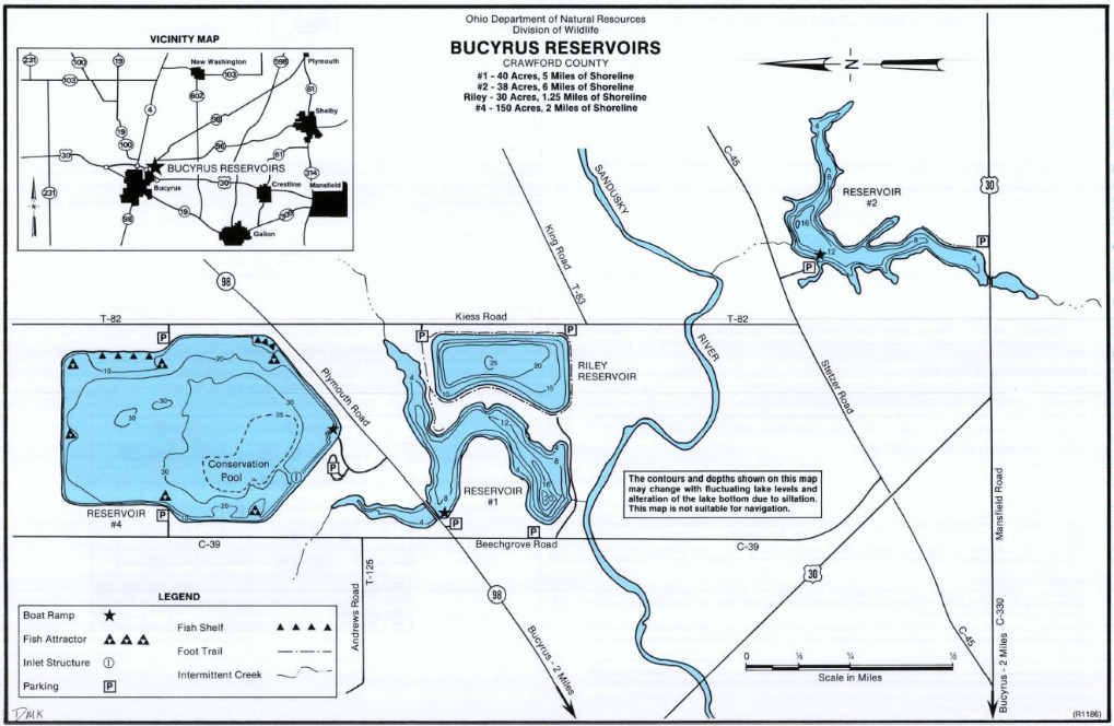 A Ohio man and his friend were fishing at a reservoir near Bucyrus in Crawford County when they began to hear whistles and howling sounds, possible communication between 2 Bigfoot.