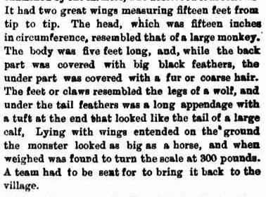 “He was accompanied [back to the scene] by this father and four other young farmers. The monster was then carefully examined by the farmers, who described it as as follows. It had two great wings measuring fifteen feet [4.8 metres] from tip to tip. The head, which was fifteen inches [38 cms] in circumference, resembled that of a large monkey. The body was five feet [152 cms] long, and, while the back part was covered with big black feathers, the under part was covered with a fur or coarse hair. The feet or claws resembled the legs of a wolf, and under the tail feathers was a long appendage with a tuft at the end that looked like the tail of a large calf. Lying with wings extended on the ground the monster looked as big as a horse, and when weighed was found to turn the scales at 300 pounds [136 kgs]. A team had to be sent for to bring it back to the village.”