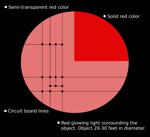 The witness described the object as circular or egg shape. It was about 20-30 feet in diameter the size of a small house. There was a pulsating red glow emitting from the object with a rhythm similar to that of a heartbeat. While the object had a definite shape it appeared to be semi-transparent. One section of the object appeared to be a darker color than the others. There were, also what appeared to be circuit board lines going through some sections of the object as well.