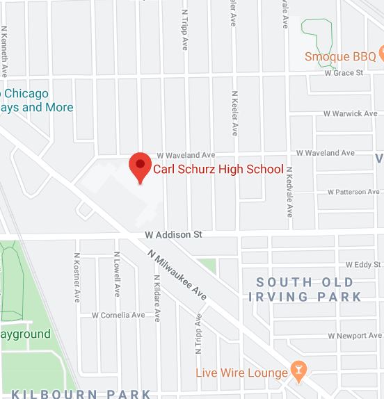 TS was driving north on N. Milwaukee Ave at W. Addison St. in Chicago's Irving Park neighborhood at approximately 8 am local time. The Carl Schurz High School was upcoming on the her right side. She then noticed the winged being gliding above the school, which she believes is 3 stories tall. TS had just dropped her son off at another school, which was located nearby the sighting location.