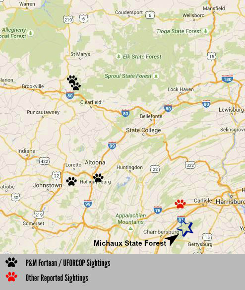 Anyway, the witnesses most likely had a run-in with a Bigfoot, which have been reported throughout Michaux State Forest. But then again, bi-pedal canines have been reported in Cumberland County and in Michaux SF. Yellow eyes are indicative of canine and / or feline.