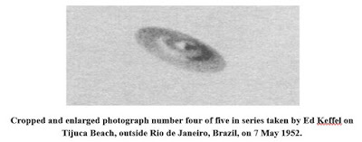 On Wednesday, 7 May 1952, a flying saucer, blue-gray in color, was witnessed by hundreds of people passing over Rio de Janeiro, Brazil. Fortunately, a cameraman and a journalist from the ever-popular O Cruzeiro magazine were in the area to faithfully record this spectacular event, hanging out, as it were, on the Tijuca Beach (Barra da Tijuca) when the object first appeared out over the ocean, heading toward the city at a fast clip. O Cruzeiro’s staff photographer, Ed Keffel, took five snapshots of the saucer. In the photographs, the UFO looked akin to a pot lid with a knob-like protuberance in the center. Keffel described the saucer as “coming in from the sea and passing several hundred feet over our heads. It appeared to be rocking like a slowly falling leaf, moving in a type of swooping motion.” The cameraman added that, “The object made a slow curve, picked up speed, headed back to sea and disappeared.” Keffel estimated that the object he saw and photographed was larger than a commercial airplane. It was round and wingless, definitely conforming to the traditional image one has of a flying saucer. The journalist accompanying Keffel, Joao Martins, wrote the original two dispatches for the International News Service (INS) about the incident that appeared in the cited Rio de Janeiro newspaper and other periodicals throughout Brazil, and a more detailed account in the 24 May 1952 issue of O Cruzeiro weekly magazine.