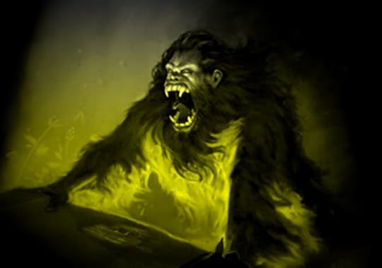 He is said to be seven feet high and possessed of great muscular power. His eyes are unusually large and fiery red; his hair hangs in a tangle and matted mass below his waist, and his beard reaches below his middle. His entire body is covered with hair and his whole aspect is most frightful. He shuns the sight of them but approaches with wild and horrid screams of delight every woman who is unaccompanied by a man.