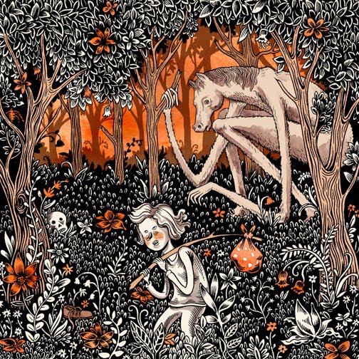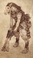 He tracked his mysterious quarry for miles, following tracks of a size and shape he had never seen. Eventually his 45/70 caliber ball did its job and the beast collapsed, allowing the old hunter to close within a hundred yards at which point he fired again, ending the monsters violent thrashing. He was crestfallen to see that in the ruckus the specter seemed to have been killed as pieces of bone and cloth were scattered about the beast and there was no sign of its rider.