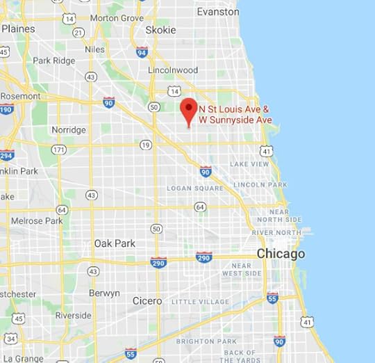 According to Kel, "The figure was under the streetlamp on St. Louis [Avenue] and Sunnyside [Avenue] in Chicago, on the northwest side of the St. Louis sidewalk just across Sunnyside. I was on the southwest side of the St. Louis sidewalk on the other side of Sunnyside."