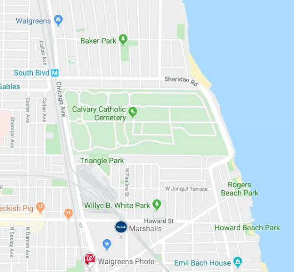 I'm an Uber driver and I was making my way towards Evanston, IL around 12:30 am at night to end my work day. When driving from Chicago to Evanston on Sheridan Rd, you pass between the lake and a large cemetery called Calvary Cemetery, and I take this route most nights when I'm returning home. As I was heading north on Sheridan Rd between the lake and the cemetery, I saw a huge row of lights that looked like a floating platform or something directly to my right out in the lake. I was thrown off because I take this route home every night and have never seen a boat of any out there at night, much less something that clearly didn't look like a regular boat at all. I pulled around to the little beach area in Evanston to get a better glance and could see that this thing was very far out on the water, but looked massive in size and seemed in a completely different area from where I thought I had seen it originally. It seemed to be drifting south, but because the night was completely dark, it was difficult to have any kind of reference point.