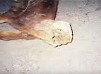 So what happened is, I waited about 5 minutes when I knew the being and the vehicle was gone. I unlocked the door. I had my camera with me. I had 5 pictures left on the camera. Got out of the truck and walked across the street of the exit ramp to see what this being had dropped on the side of the exit ramp and when I got over there I shined the flashlight on it. I was surprised that it was a carcass of some kind. Looking at the hooves, I could tell it was a deer. The deer's head was bit clean off and it had discolored fur around its neck. The inside of the deer, the chest cavity, was all completely removed. Its internal organs were all ripped out to the back of the spine. The internal cavity was burned out.” RB