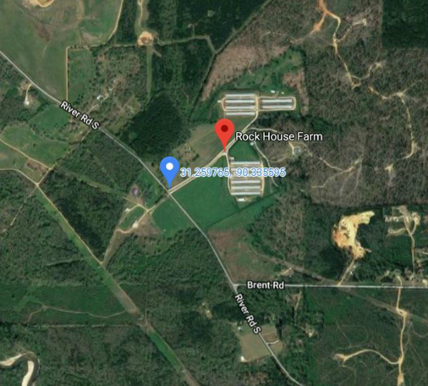 The witness VK was driving north along River Rd. South near McComb, Mississippi in Pike County. He had just passed Brent Rd. and was approaching the access road to a large poultry processing facility.