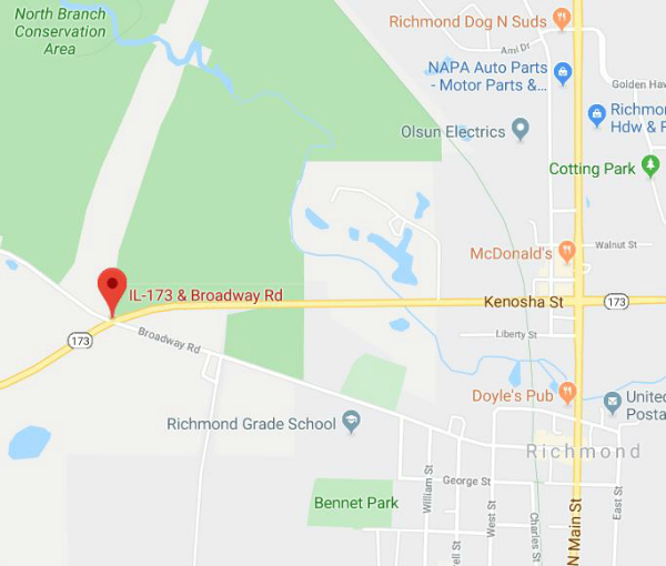 Friday October 5, 2019 around 10 pm my 17yo son and I were coming home through Richmond, Illinois. He wanted McDonald’s. We took the back roads home (we live in Wisconsin on border) and on Rt 173 and Broadway (I believe it’s Broadway) we both saw something very tall (6-7 feet) hunched over looking with the brightest red eyes we’ve ever seen! It looked as if it were floating or hopping. We couldn’t make out much as it was very dark, but it was not like any animal we’ve seen before! When I got home I started Googling animals and found some Mothman myth. I'm not sure what we saw but it was out of the ordinary. We take this road often but only a few times at night and had never seen this before. It was maybe 10-20 feet from our car and my son was freaking out telling me to go, so we didn’t stop. Our family thinks we’re crazy and teases us we saw a zombie, so I’d prefer this to stay anonymous. I came across your info and thought I’d share. We didn’t notice any wings but it was dark out. We both thought it was hopping like a kangaroo and now I’m curious if there are any other odd sightings in this area. MO