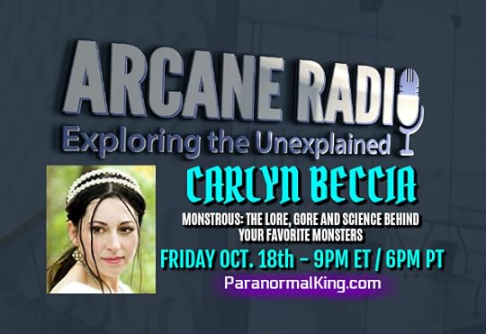 Join me as I welcome author, illustrator and speaker Carlyn Beccia to Arcane Radio. Carilyn has recently published 'Monstrous: The Lore, Gore, and Science Behind your Favorite Monsters,' a fascinating encyclopedia of monsters that delves into the history and science behind eight legendary creatures, from Bigfoot and the Kraken to zombies and more. It is a highly visual and fun-to-browse book for children and adults as well. This was Carlyn's 10th published title. She has been the recipient of many prestigious literary and book illustration awards. Her website can be found at www.carlynbeccia.com - This should be a very entertaining show! Join us this Friday, October 18th at 9PM ET / 6PM PT on ParanormalKing.com or the direct link at Mixlr - Paranormal King - Meet us in the chat room...just click the banner or go to www.paranormal.olicentral.com. You are invited to join the Phantoms & Monsters chat & discussion portal at Phantoms & Monsters discussion & chat server, which will be active during the show