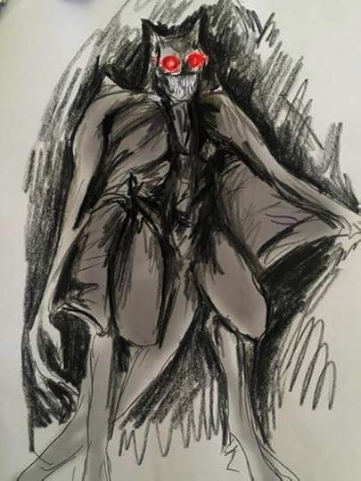 I’ve had a sighting of a very large bat creature. I was traveling not far from my home on the reservation where I noticed something flickering in the sky. Then this thing appeared about 200 ft in front of my car, standing about 12 ft. tall with a wingspan of the entire width of the road. It was grayish brown in color and it had red glowing eyes, as bright as a brake light on a car. It looked at us snarling with long knife like teeth. It took one step, didn’t flap it wings and took off into the air. I was glad I had my friend with me because that assured me it was real. I drew a picture of the creature. I can send if you like. I live in Arizona (Gila River Indian Community) and this happened about 4:00 in the morning in Dec. 2017. JB