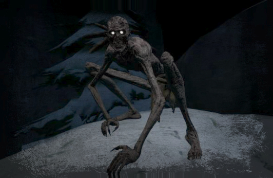 I stopped the car, half expecting it to just be a deer and run out of the way, but the creature didn't move, it just stayed stationary, staring at me, giving me a good 10-15 seconds to look at it. It the slowly stood up on two legs, still looking at me in the car. It was BIG, the top of my car probably only reached the lower rib cage region, so I'd estimate it was probably 9-10 feet tall. It was pale grey, hairless and gaunt. I could see its rib cage and spine. It had LONG bony arms, probably each about 4 feet long, and large claw-like hands. (The closest comparative description I could give is the grey, bony werewolf in the third Harry Potter movie).