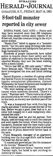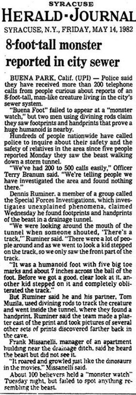 Police said they have received more than 200 telephone calls from people curious about reports of an 8-foot-tall, man-like creature living in the city’s sewer system. “Buena Foot” failed to appear at a “monster watch,” but two men using divining rods claim they saw footprints and handprints that prove a huge humanoid is nearby. Hundreds of people nationwide have called police to inquire about their safety and the safety of relatives in the area since five people reported Monday, they saw the beast walking down a storm tunnel. “We’ve had 200 to 500 calls easily,” Officer Terry Branum said. “We’re telling people we have investigated the area and found nothing there. Dennis Ruminer, a member of a group called the Special Forces Investigations, which investigates unexplained phenomena, claimed Wednesday he found footprints and handprints of the beast in a drainage tunnel. “We were looking around the mouth of the tunnel when someone shouted, “There’s a track,” Ruminer said. “There were a lot of people around and as we went to look a kid stepped on the track, so we only saw the front part of the track. “It was a humanoid foot with five big toe marks and about 7 inches across the ball of the foot. Before we got a good, clear look at it, another kid stepped on it and completely obliterated the track.” But Ruminer said he and his partner, Tom Muzila, used divining rods to track the creature and went inside the tunnel, where they found a handprint. Ruminer said the team made a plaster cast of the print and took pictures of several other sets of prints discovered farther back in the cave. Frank Missanelli, manager of an apartment building near the drainage ditch, said he heard the beast but did not see it. “It roared and growled just like the dinosaurs in the movies,” Missanellia said. About 100 believers held a “monster watch” Tuesday night, but failed to spot anything resembling the beast.