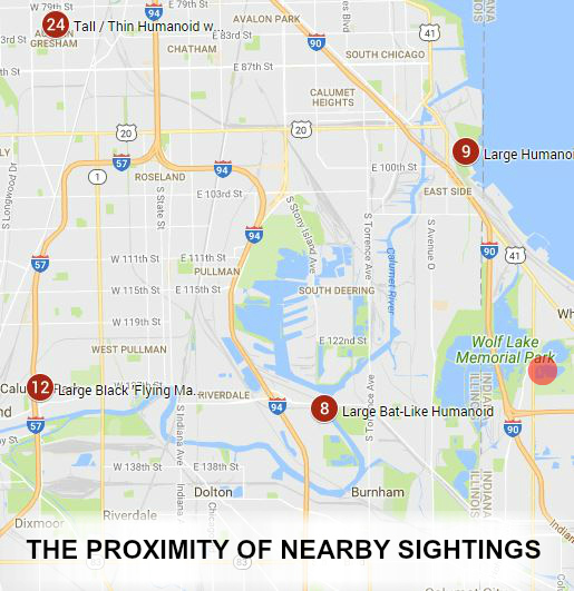 NOTE: This may be an excellent general area for a concentrated investigation...including the other nearby locations where the entity was seen. The 'red lights' were within 100-200 ft from the point of observation by the witness...and were close together. Did the witness see the red eyes of one of these humanoids? Any updates will be included with this post. Please note that was a sighting of a flying bat-like humanoid near the Indiana Dunes National Lakeshore, approximately 20 miles east of this location. This sighting has been added to the Chicago Phantom / Owlman / Mothman / Man-Bat / Flying Humanoid Reports - Chicago Metro Area - Interactive Map