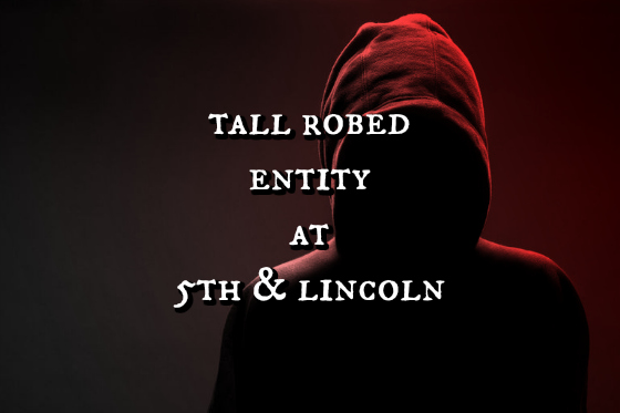 "I had just dropped off my first rider and was on my way to pick you up. I pulled up to the stop sign on 5th & Lincoln. I remember exactly where I was because I was parked over the crosswalk. That's when I saw it. It was 8 feet tall and wearing a robe, standing on the edge of the crosswalk. It was larger than any man could be. When I caught sight of it; I don't know what happened. My body was frozen in a state of total fear. I wanted to shout; I wanted it to go away. I had never been so afraid; I thought I might pass out. I was totally frozen. The robed figure then began crossing the street, passing through the front of my car. HE WENT THROUGH MY CAR! When he did, all my radio's volume went up to maximum, and I was consumed with... evil?" she paused
