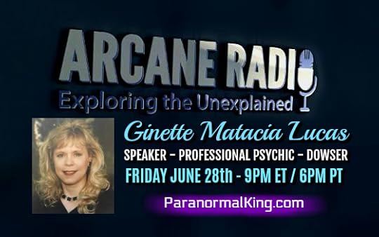 Join me as I welcome speaker, professional psychic and dowser Ginette Matacia Lucas to Arcane Radio. Ginette is known for working with police, families and businesses on various projects - from missing persons, finding missing objects, finding treasure and solving mysteries. Ginette has interviewed with and without her father, Louis Matacia, or her expert team members on the paranormal. She has given custom lectures on her work, training & development in the paranormal & dowsing. Her website can be found at ReachGinette.com - This should be an interesting show! Join us this Friday, June 28th at 9PM ET / 6PM PT on ParanormalKing.com or the direct link at Mixlr - Paranormal King - Meet us in the chat room...just click the banner or go to www.paranormal.olicentral.com