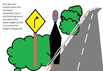 Below is a really bad drawing of what he looked like and a maps link to the part of the highway I saw him on. I don't remember the exact place but it was somewhere on that stretch of highway - Derateo