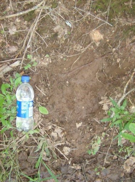 May 25, 2010: I found another footprint while walking the dogs, on another old tractor road, near the same area I had found the previous print. This track was approx 21'' long, 8'' wide at the ball and 5'' wide at the heel, I was carrying the same size bottle as before, shown in the photo for ref. The track appeared on the side of a short 3' bank. There was a short skid mark at the top of the track, but the toes are clearly visible, as is the rest of the track.