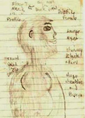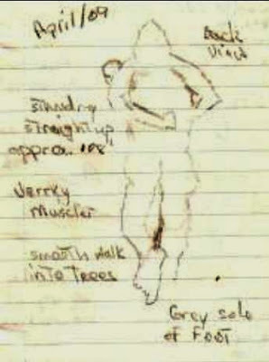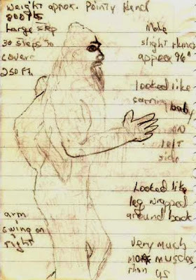 I was sitting at the open window while this creature walk along as it continued eating rose hips. It stopped about 30 ft from this thicket and tried to peer into this area. When it didn’t notice any pigs (after a few seconds) it turned around, twisting at the waist. It looked right at me with a kind of smirk on its face. I'm sure it looked me right in the eyes. There was a ‘feminine’ look to its face which was a lot more human looking than I thought it would be. I drew a sketch of what I saw as it departed into the woods behind my house. All I kept telling to myself was “that's what made that large pile of crap that I found.” I didn't go look for tracks or hair afterwards because I have a condition that causes my muscles to involuntarily shake for extended periods of time - similar to Parkinson's Disease but all over my body. At that time I didn't want to chance and have something happen to me.