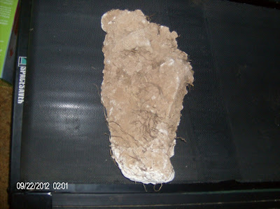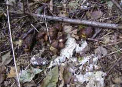In the middle of May of 2008, my grandson (who was 5 yrs. old at this date) and I took my two dogs (both Rottweilers) for a walk in the wooded area next to my house. This place is approximately 100 acres that has not been clear-cut, but has had areas logged off about 10 yrs.ago and is growing up in thick bush. We were walking on an old tractor road which intersects another road. At this junction my grandson finds a pile of excrement that was huge. The pieces were 3'' dia. x 12'' long cross piled on top of each other (3 pieces). It looked like someone squeezed a large tube of toothpaste. My dogs wanted nothing to do with it and avoided it at all cost.