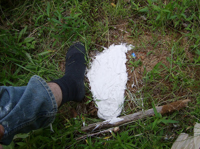 April 26, 2010: I found the first footprint approx 1/4 mile south of my house, near a swampy area by a pond a few hundred yards south of the second sighting. The foot print was approx is 15'' long, 5''wide at the ball, and 4'' wide at the heel. The bottle in the photo is 10'' long and used for size comparison.
