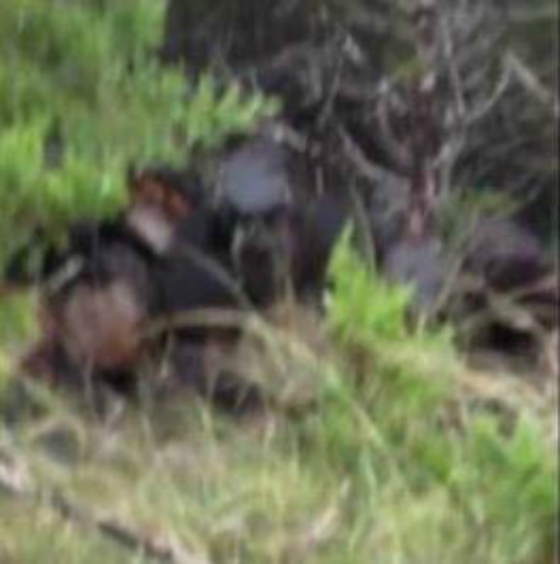 There is a large powerful male in the group that is covered auburn-red colored hair. This individual is rarely seen and is quite stealthy. The height is estimated to be around 8 ft., with broad muscular shoulders with no visible neck. On one occasion, it was seen in early evening while screaming and communicating with another Bigfoot from the opposite side of the ranch. JR described the scream as similar to a human woman screaming, with intermittent deep grunts. The sound of the answering Bigfoot were long low-pitched bellows.