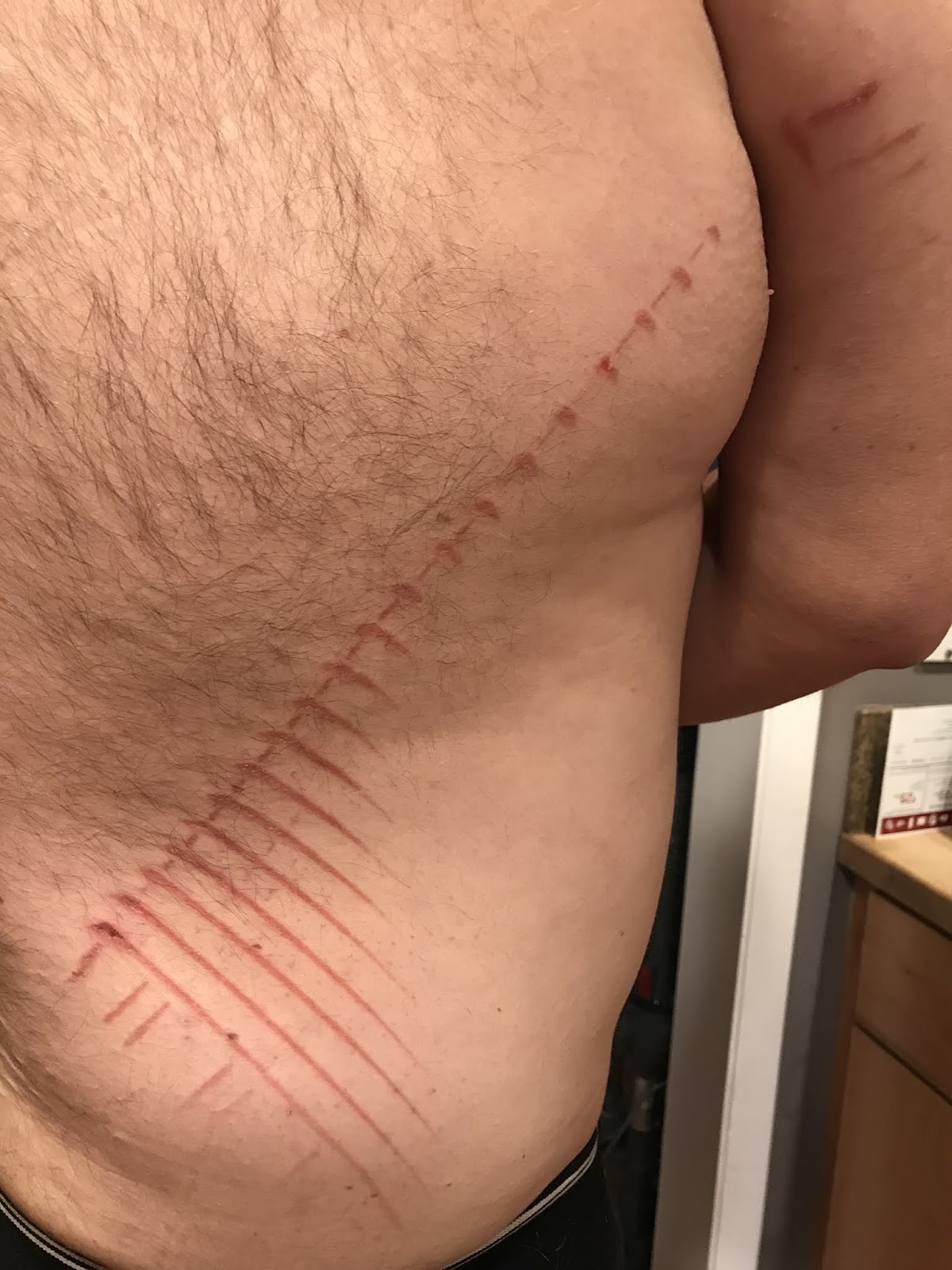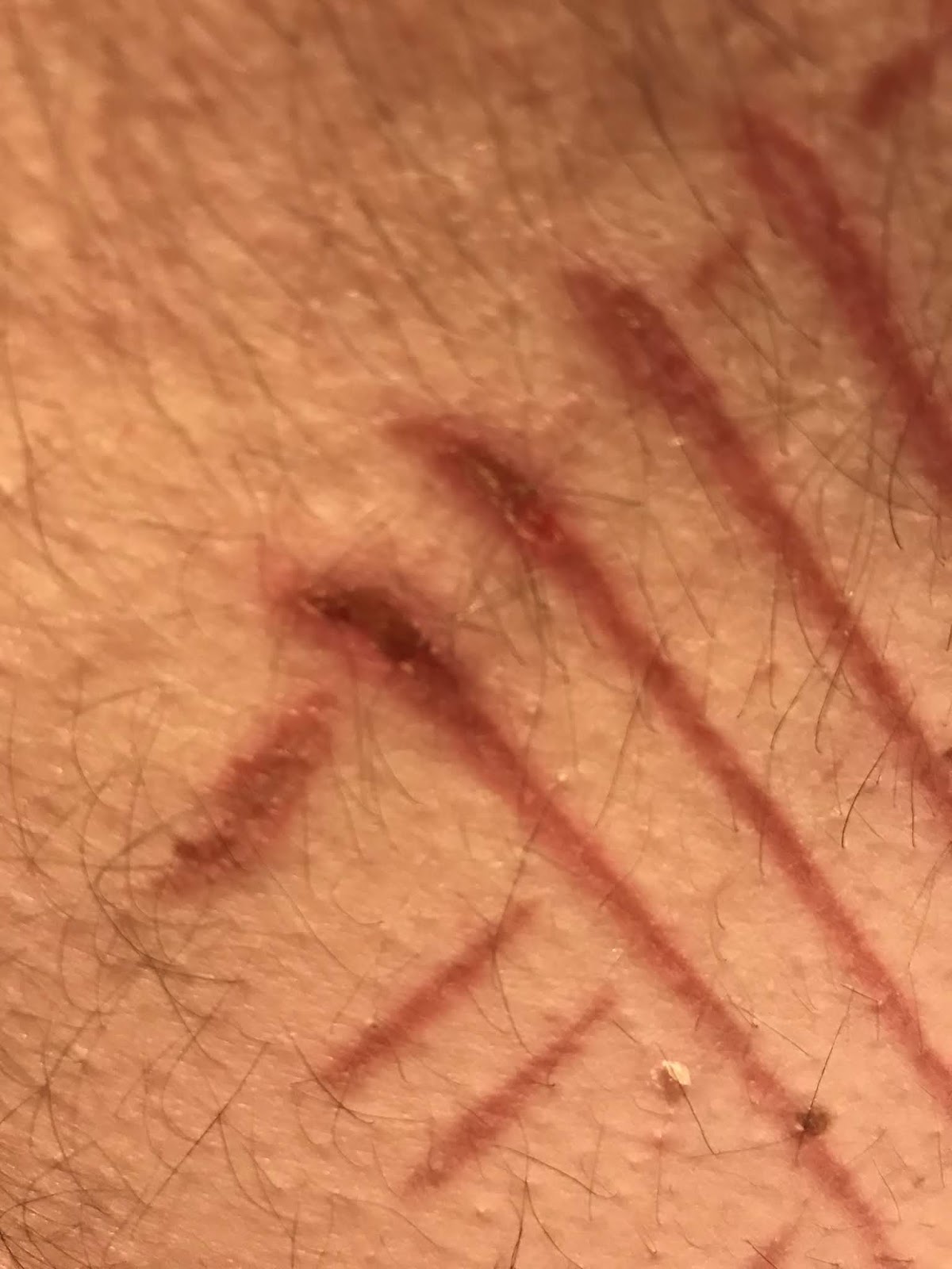 Boise, Idaho - 2018-11-07: Fell asleep around 11:30pm in my recliner watching TV. I woke up at 1:30am to move to the bedroom and upon relieving myself in the bathroom noticed these scratches. They are very orderly, evenly spaced and run from my arm down to my hip. While they look and feel like scratches, with some of the dots being deep enough to form scabs, the bottom along the hip has perpendicular marks. There is nothing in my house that could have caused this by accidentally running into it. They could be burn marks as well. It’s hard to tell. My wife has no idea what this could be and we are both very baffled by what could have caused this.