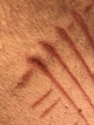 Now 3 days after the incident the wounds are very likely burn marks as the marks have not faded. I have also spent quite a bit of effort looking over my entire property for any grill or grate that could have made this but have not been able to find anything that would match the pattern. - MUFON