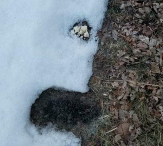 Idaho Falls, ID - 2018-03-20: I had just arrived home from work. I was standing on the porch smoking a cigarette with my SO when she pointed to a spot nearby on the lawn that was dark. I thought maybe it was trash or debris, so I went to go clean it up. When I got closer, it became apparent that the earth had been burnt, although the grass on the burnt earth is still in tact. my oldest son (3) has been speaking of aliens and how he talks to them for approx. a week now. - MUFON