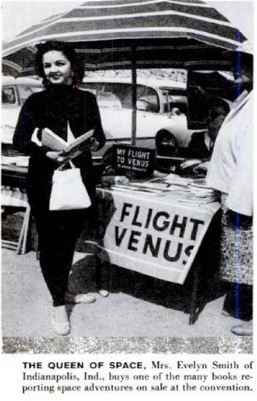 One of Eric Von Daniken’s “Space Gods” takes on a contemporary look. “California Styling” with her 1954 Chevrolet Bel-Air white-topped convertible and sporting a Mickey Mouse Club sweater, Mrs. Evelyn Smith can be seen below, self-identifying as “Aura Rhanes” and posing for Argosy magazine photographer Martin Dain at Second Interplanetary Spaceship Convention held at Landers Field, California, on Saturday, 12 March 1955. Jules B. St. Germain, an attorney and regular writer on paranormal phenomena for Argosy, believed that he once spotted the Clarion commander in the company of contactee Howard Menger out at his Highbridge, New Jersey farm, at a later date.