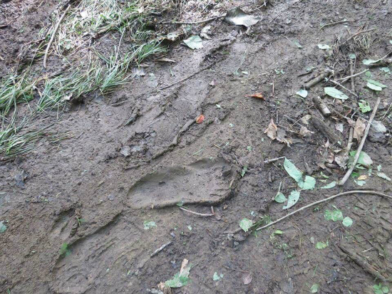 "Took photos of these prints on Kentuck Trail from the Kentuck Campground area towards Thorb Knob. These prints were crossing the path in the oppisite direction and way out on the trail, not close to the campground or Thorp Knob. Took these in July 2017. The older tracks were found on Old Mitchell Place Trail in August 2017. No measurements or casting taken"