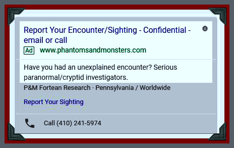 REPORT SIGHTING: CLICK HERE - DESCRIBE YOUR ENCOUNTER / EXPERIENCE