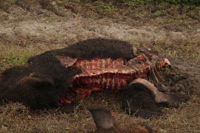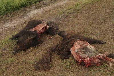 At 11191 Moore Rd we pulled our car over, got out and began observing the area for eagles. We did not find any, however, something else caught our attention. Two dead wild boars on the side of the road. Both bodies presented in typical cattle mutilation conditions. There was very little decomposition and the animals skin looked to be almost surgically removed. Perhaps even stranger than the presence of the bodies, was the fact that there were two, lying right next to each other. We both agreed that it was highly unlikely that two wild boars would be hit at the exact same time in the exact same place.