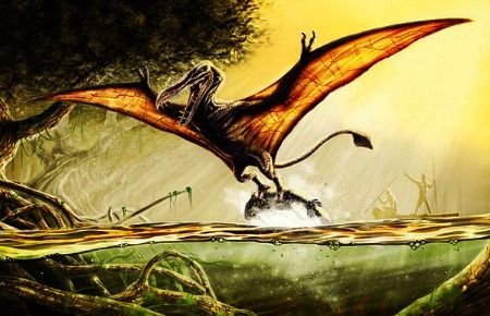 In Africa, the native people of the Congo, Zambia, and several other regions speak of Kongomoto. It is described as featherless with smooth skin, a beak full of teeth, and a wingspan of 1–2 meters (4–7 ft). On the Gold Coast, British explorers in the 1920s heard tales of the Susabonsam, which grew to the height of a man and had thin, tenebrous wings like a bat. The truly large sightings of Kongamoto could be a surviving group of Quetzalcoatlus northropi, which, at the height of a giraffe, was the largest flying animal to have ever lived. Of course, they could also be condors, various storks, or other large birds seen in silhouette—or they might only be legends or outright hoaxes. But in 1988, Professor Roy Mackal led an expedition into the deserts of Namibia. He was investigating intriguing reports of a creature with a 9-meter (30 ft) wingspan seen gliding through the air. Eyewitness reports stated that it would appear at dusk, flying between two hills. Some even claimed that the winged monstrosity glowed in the dark. While the mission was unsuccessful, one expedition member claimed to have seen it from a distance, describing it as “a giant glider shape, black with white markings.”