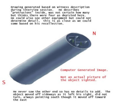I had a preliminary description from John who was stopped. He made a sketch of the object as he observed it through the trees. This sketch will be made a part of this report as it progresses. John described the object as a cylinder about 10 – 15 feet across and about thirty feet long. He said it was about three times longer than it was wide. In the end, he could see there was some kind of equipment or pointed objects. There was also a haze around the end of the object that partially obscured his view inside. The haze was a pale green fog that seemed to partly obstruct a clear view of the end of the object. He could see only one end; the other was pointing away from him.