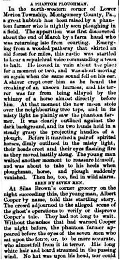 In the north-western corner of Lower Merion Township, Montgomery County, Pa., a great hubbub has been raised by a phantom farmer who is nightly seen plowing in a field. The apparition was discovered about the end of March [1886] by a farm hand returning from courting. Emerging from a wooded pathway that skirted an old forest for miles, this rustic was startled to hear a sepulchral voice commanding a team to halt. He looked in vain about the place for a moment or two and was about to move on again when the same sound fell on his ear. A shiver crept over him as he heard the croaking of an unseen harness, and his terror was far from being allayed by the whinny of a horse almost directly before him. At that moment the new moon stole over the neighbouring treetops, and in its misty light, he plainly saw the phantom farmer. It was clearly outlined against the dark background, and its two hands held in a steady grasp the projecting handles of a plough. Before it marched a pair of spirited horses, dimly outlined in the misty light, their heads erect and their eyes flashing fire as they moved hastily along. The young man waited another moment to reassure himself and was about to take to his heels when ploughman, horse, and plough suddenly vanished. Then he, too, fled in wild alarm.