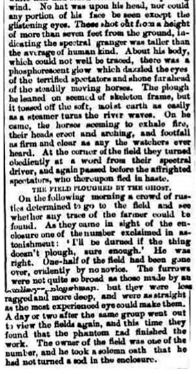 At Silas Brown's corner grocery on the night succeeding this, the young man, Albert Cooper, by name, told this startling story. The crowd adjourned to the alleged scene of the ghost's operations to verify or disprove Cooper's tale. They had not long to wait. Without the noises that had warned Cooper the night before, the phantom farmer appeared before the eyes of the seven men who sat upon the fence, or, to be more accurate, who almost fell from it in terror. His long white hair and beard streamed in the passing wind. No hat was upon his head, nor could any portion of his face be soon except the glistening eyes. These shot out from a height of more than seven feet from the ground, indicating the spectral granger was taller than the average of humankind. About his body, which could not well be traced, there was a phosphorescent glow that dazzled the eyes of the terrified spectators and shone far ahead of the steadily moving hones. The plough he leaned on seemed of skeleton frame, but it tossed off the soft, moist earth as easily as a steamer turns the river waves. On he came, the horses seeming to exhale fire, their heads erect and arching, and footfall as firm and clear as any the watchers ever heard. At the corner of the field, they turned obediently at a word from their spectral driver and again passed before the affrighted spectators, who thereupon fled in haste.