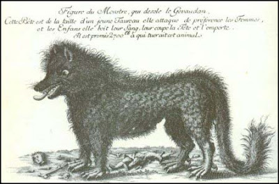 The Beast of Gévaudan is a name given to man-eating wolf-like animals alleged to have terrorized the former province of Gévaudan, in the Margeride Mountains in south-central France from 1764 to 1767 over an area stretching 90 by 80 kilometers. The beasts were consistently described by eyewitnesses as having formidable teeth and immense tails. Their fur had a reddish tinge and was said to have emitted an unbearable odor.