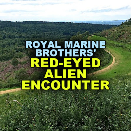 There, ahead of me and scrambling up that steep incline was my brother. I had 'caught up' with him and in later years he told me that he was on a 'rise' before reaching that incline and that when he looked back to check that I was with him he saw to his horror, that I was still standing at the original spot with two aliens clearly seen towering over me. By the time he had scaled that steep incline, I had caught him up. He must have seen me but seconds before I had turned and fled. As a very fit, young Royal Marine and at the same time 'fuelled' with sheer panic, I can answer that one quite clearly. As we feverishly tried to climb that steep incline so we would slip back down a 'foot' for every 'three' we made upwards. Eventually we made the top. Den mounted his motorbike, 'kick started' it and I leapt onto the pillion and away we sped in great haste. Even as we rode at speed along that road I was half expecting to be seized and pulled off that motor-bike and I clung tenaciously, my arms around my brother's waist. I remember that just before we reached the city of Guildford, eleven miles on, Den pulled over and cut the engine. A tall, long ash fence lay close to us and against this we dropped onto our haunches unable to believe what had happened and how we had escaped a 'fate worse than death'. I remember nothing more after collapsing against that fence. I haven memory of arriving home, not even of the rest of my leave. I do not to this day remember returning to my barracks nor of the intense training that followed. I have hitherto told no one outside of the family of our experience at the Punchbowl that 'never to be forgotten' night.